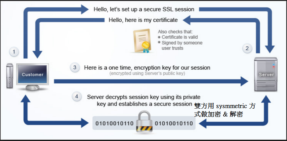 1.Client透過HTTPS連到Server。 2.Server傳送Server Public Key給client。 3.Client產生後續傳輸資料需要用來加密\/解密用的Session Key,並以Server傳過來的Public Key加密後回傳給Server。 4.Server用Private Key解開Client以Public Key加密回傳的資料,以取得Session Key。 5.後續Client與Server間傳送資料就以此Session Key來做資料加密與解密的處理,處理的時間會比使用Server的Public Key與Private Key要快速許多。